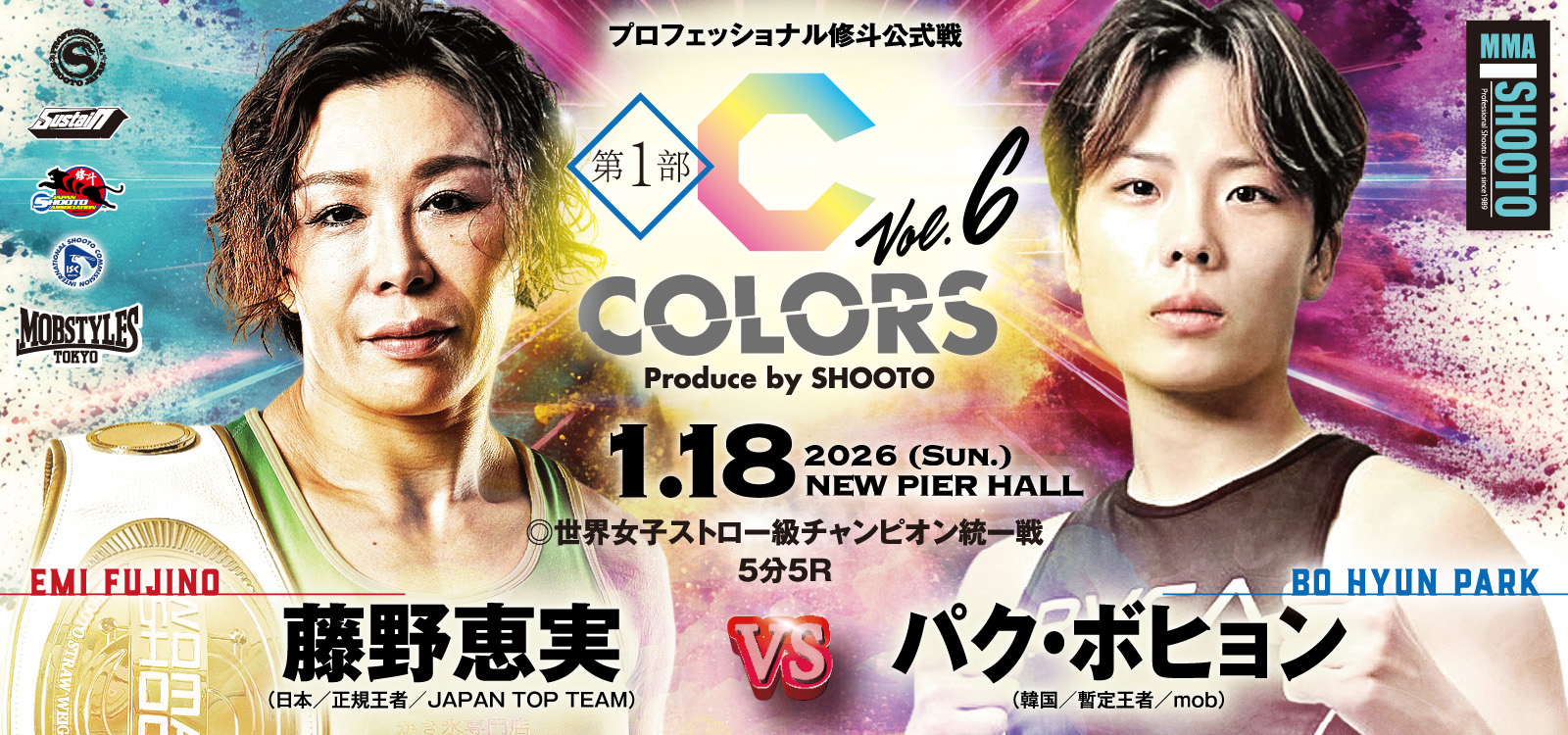 1.18 COLORS ニューピアホール大会 第1部 COLORS Produce by SHOOTO Vol.6決定対戦カード発表。“女王”藤野恵実とパク・ボヒョンの世界王座統一戦!女子版“スーパーノヴァ”徳本望愛がLION ROCK王者・杉本恵と対戦。インフィニティリーグerika vs.高本に全日本王者・翠川のデビュー戦など4カードが決定!