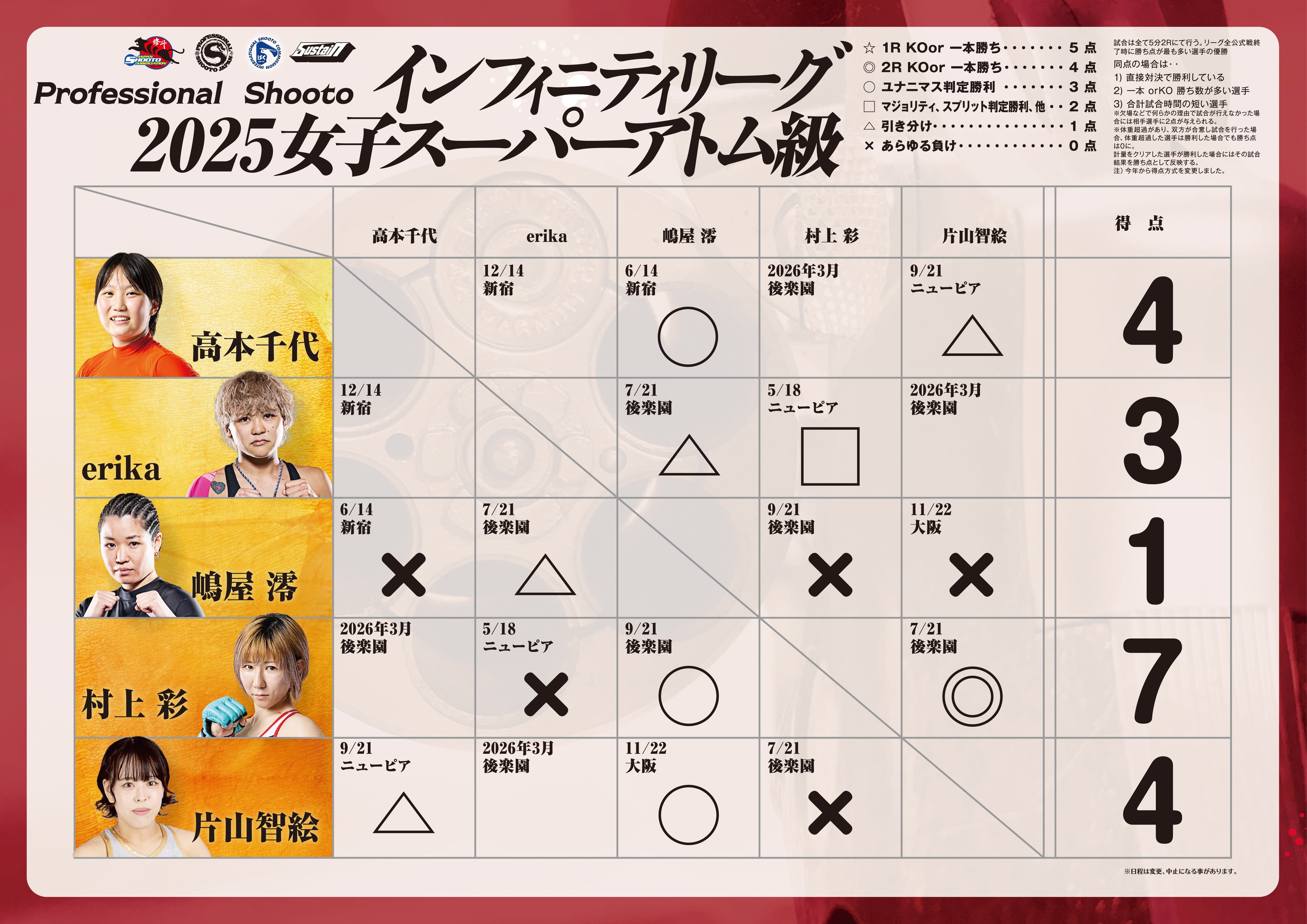 そしていよいよ佳境を迎えるインフィニティリーグ2025女子スーパーアトム級公式戦、高本千代(勝ち点4/高本道場)vs erika(勝ち点3/THE BLACKBELT JAPAN)の一戦が行われる。まだまだ混戦状態にありここからの勝敗が優勝へと直結する。勝つだけではなく、“いかに早く勝つか”が重要となるインフィニティリーグ。優勝を占う重要な一戦をお見逃しなく。