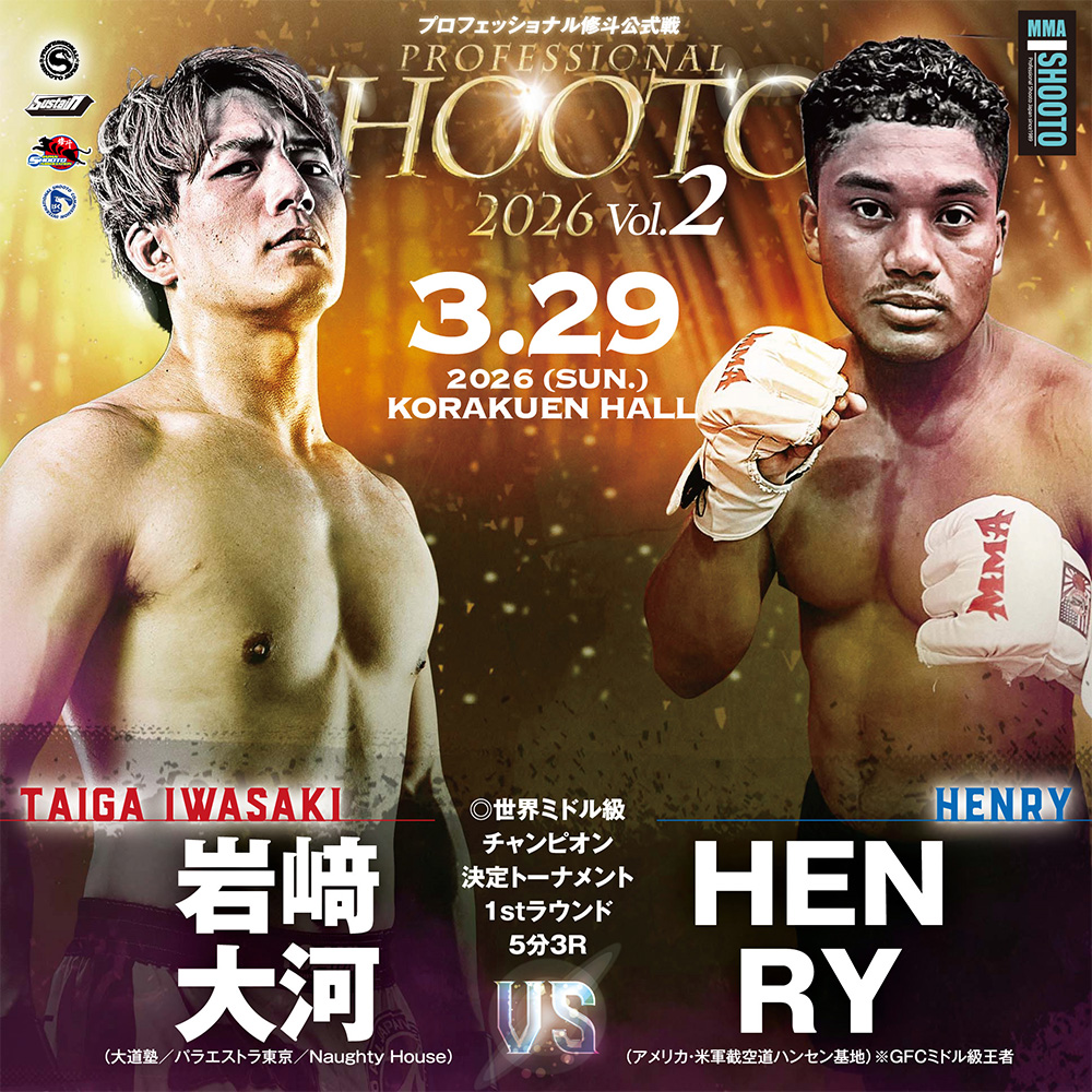 1stラウンドの対戦相手は修斗初参戦となるHENRY(アメリカ・米軍截空道ハンセン基地)。現役軍人として沖縄基地で任務に当たる傍ら、キャンプ内にある米軍截空道ハンセン基地で創師・平原伸泰師範に格闘技を学ぶ。沖縄で開催されるGFCを主戦場として3戦3勝3KOというパーフェクトレコードを誇るフィニッシャー。年齢もまだ22歳と怖いもの無し、失うものも何もないHENRYが、“新北斗の覇王”岩﨑相手にどういった戦いを見せてくれるのか、興味深いマッチアップが決定した。
