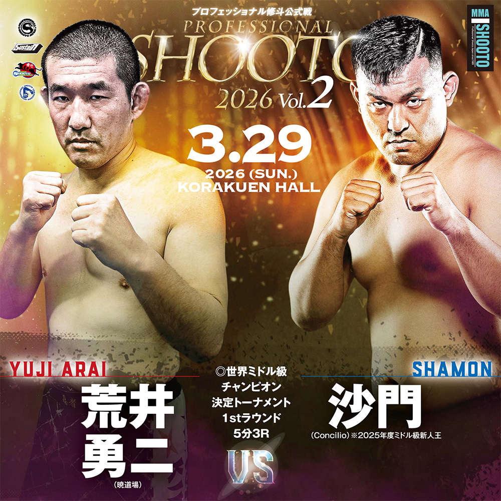 その対戦相手となるのが元環太平洋ウェルター級王者・村山暁洋を師にもつ荒井勇ニ(暁道場)。2002年のデビューからパンクラスを主戦場に国内中量級で活躍する“ベテラン”の荒井。師の村山がMMAのキャリアを歩んだ修斗のケージに足を踏み入れる。師弟での王座戴冠となるか⁉修斗vsパンクラス。ヒリヒリとした対戦が決定した。